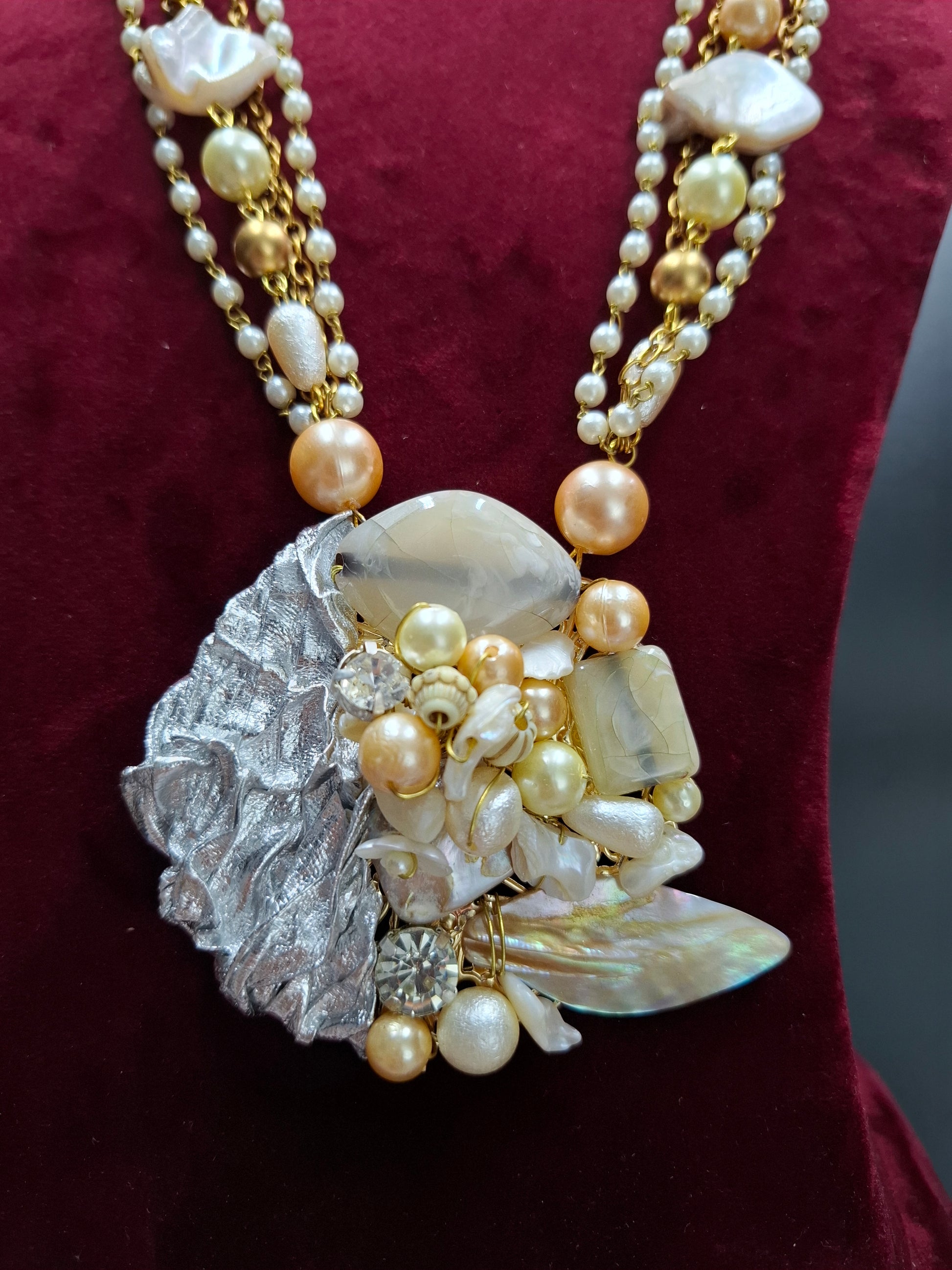 A soft blend of shimmer and structure, this celestial-inspired necklace features mother-of-pearl drops, crystal clusters, and gold accents arranged in a graceful crescent form. The layered strands and moon-petal design make it perfect for evening wear, bridal occasions, or gifting something truly unique.
