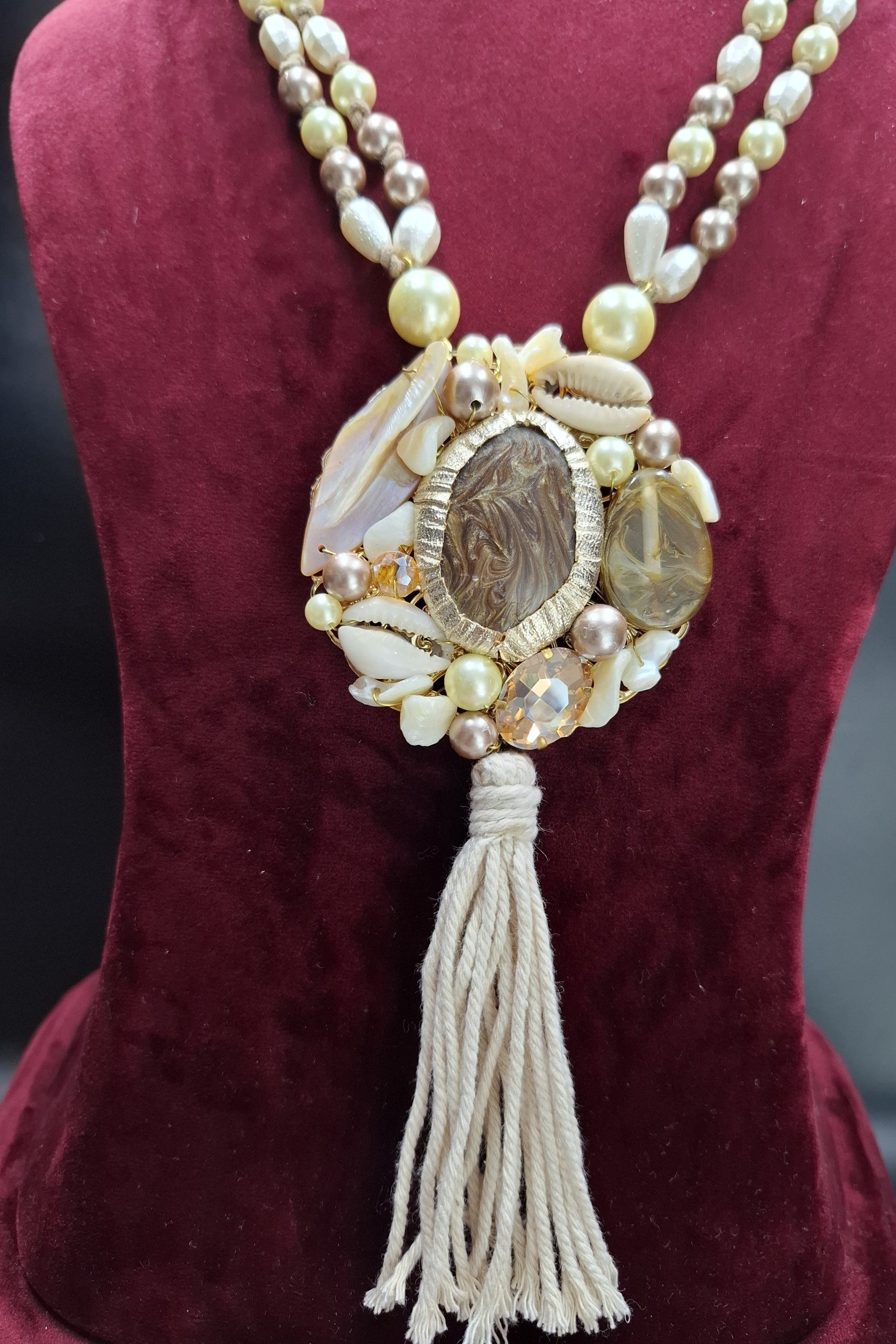 Inspired by ethnic and coastal influences, this stunning triple-strand necklace showcases a medley of natural shells, ivory pearls, and engraved brown stones. The focal pendant features a carved central piece surrounded by delicate shell chips and finished with an elegant beige cotton tassel. The matching earrings incorporate conch shells and round pearls, completing the tribal-chic aesthetic.